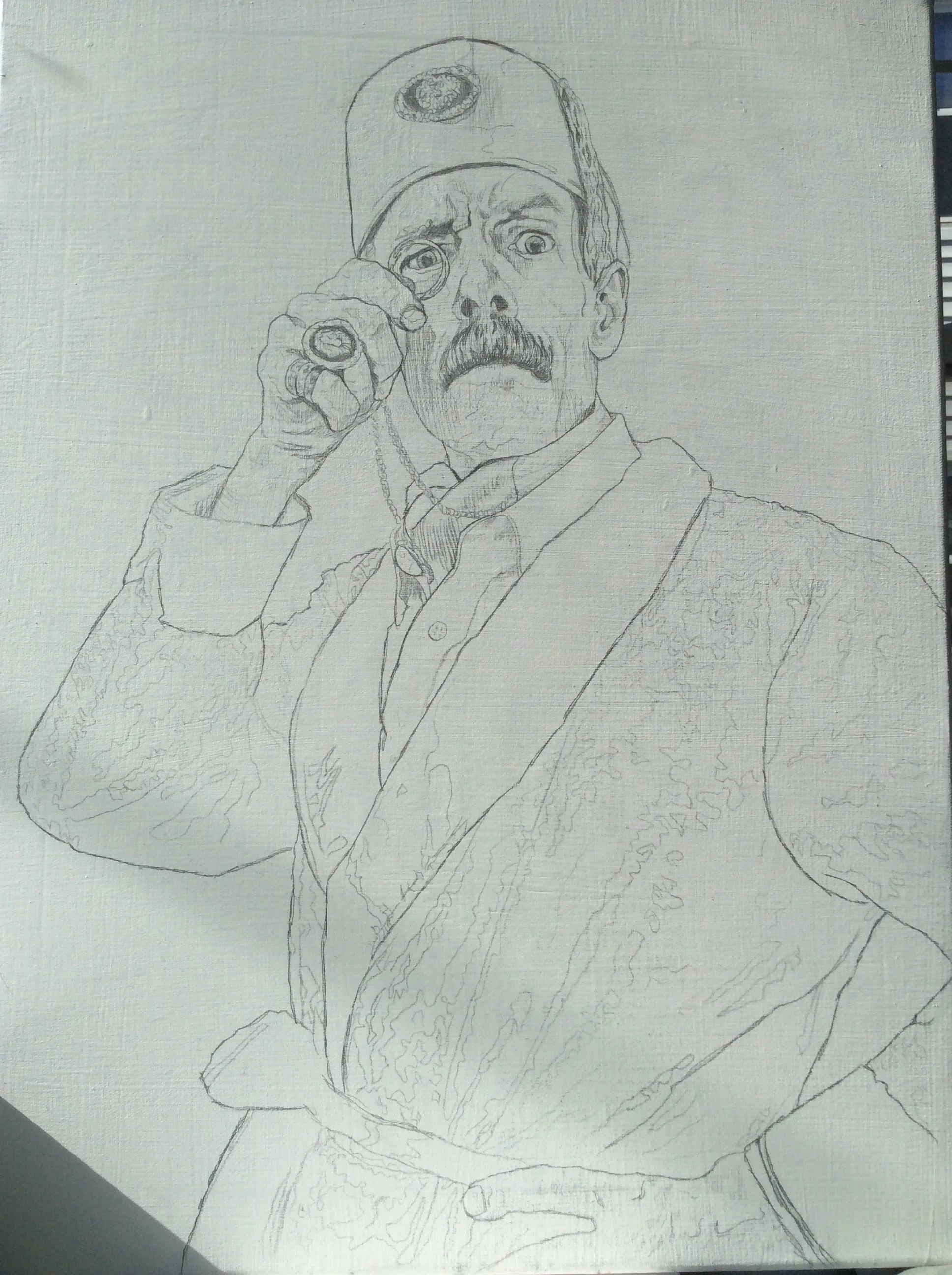•  After gently touching up the desired details on the canvas I give it a light spray of fixative as to seal it up from the oil paint. (I used to draw directly on the canvas but that became a smeared mess once oil paints came into play)